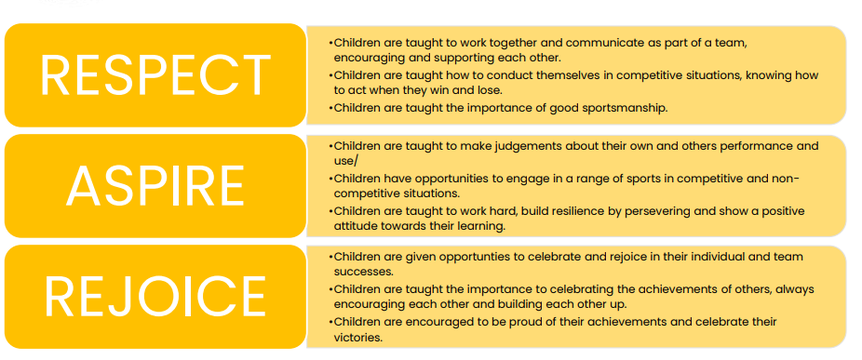 All children have the opportunity to experience competitive situations in sport and PE either on an intra or inter school basis or both. Our extra-curricular clubs are inclusive of all abilities and helps children to build confidence in themselves and to be accepting of others. Through cross-curricular studies, children learn the impacts of a healthy lifestyle and how this is achieved as well as skills that underpin life, such as teamwork, sportsmanship, self-motivation, resilience and independence.